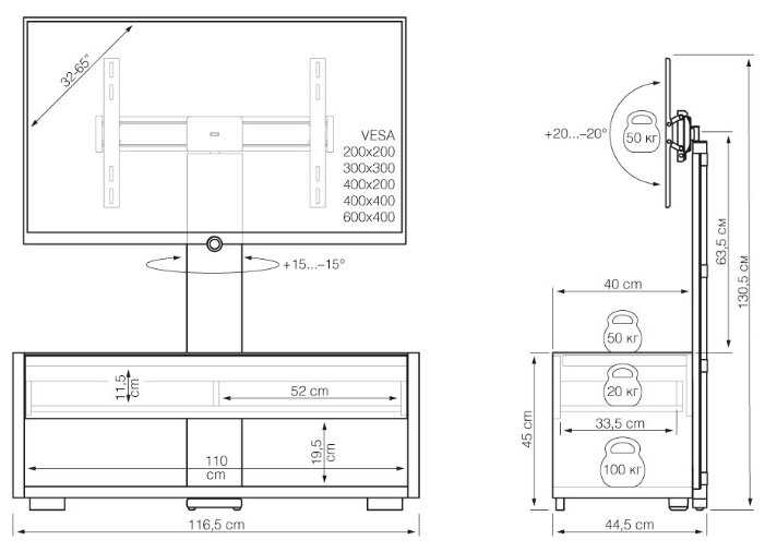 | Стандарт Vesa : | 200x200 мм, 300x300 мм, 400x200 мм, 400x400 мм, 600x400 мм |