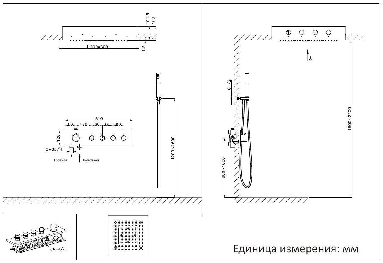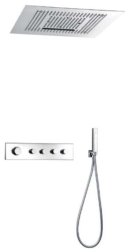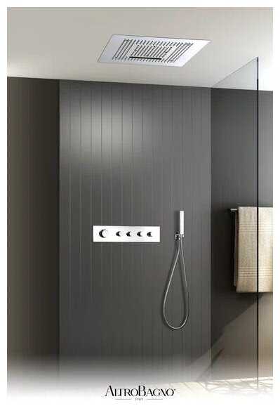 | @Комплектация : | встраиваемый механизм, термостатический смеситель настенного монтажа, латунный двухрежимный ручной душ, гибкий полимерный шланг, латунный мультифункциональный верхний душ, установочный комплект |