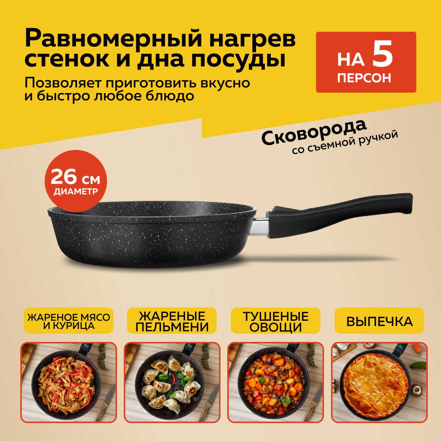 - Возможность использовать сковороду в духовке после снятия ручки, хотя с ограничением по температуре.