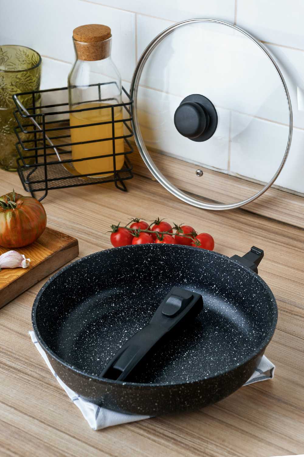 - + Хорошая глубокая сковородка с высокими бортиками . В комплекте стеклянная крышка и удобная съёмная ручка. Покрытие антипригарное, но расцветка покрытия не выглядит как имитация мрамора или гранита, а больше похожа на крупные капли и брызги молока с подтёками.