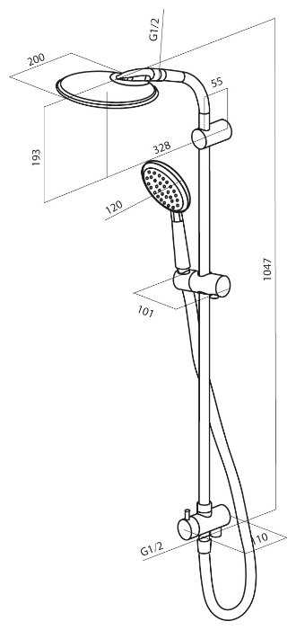 | Дополнительная информация : | высота стойки для душа: 1047 мм, диаметр душевой лейки: 120 мм, диаметр верхнего душа: 200 мм |