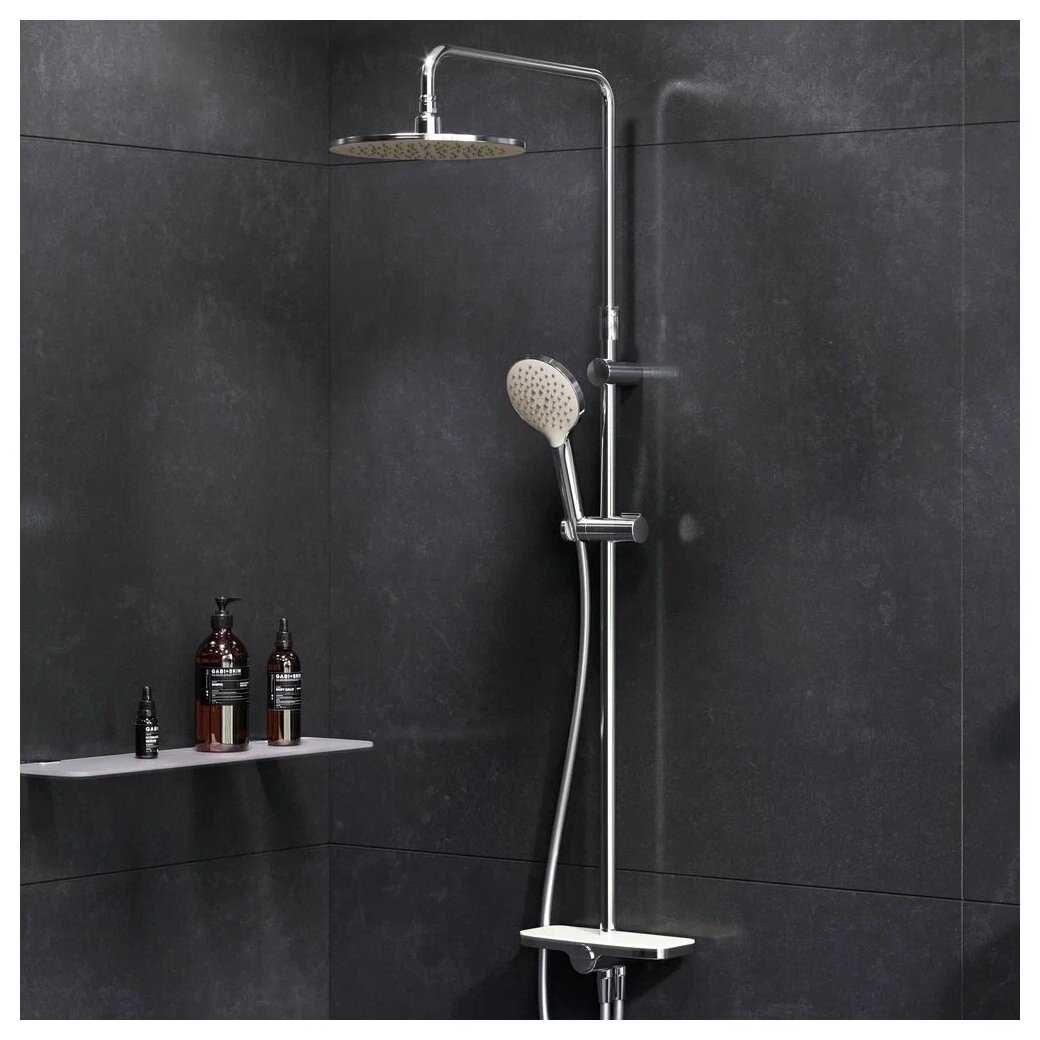 - + Прекрасное качество, фурнитура работает отлично, легкая в установке, на полочке вмещается 3-4 средства. Рекомендую. Тропический душ регулируется по высоте