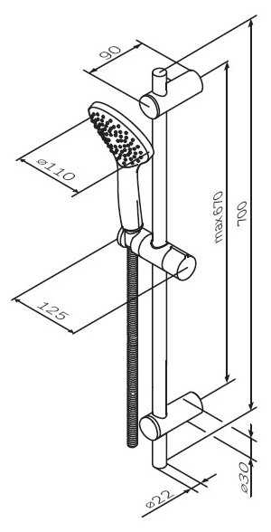 | Дополнительная информация : | ширина изделия 125 мм, глубина изделия 90 мм, высота изделия 700 мм, длина душевой штанги 700 мм, диаметр ручного душа 110 мм |