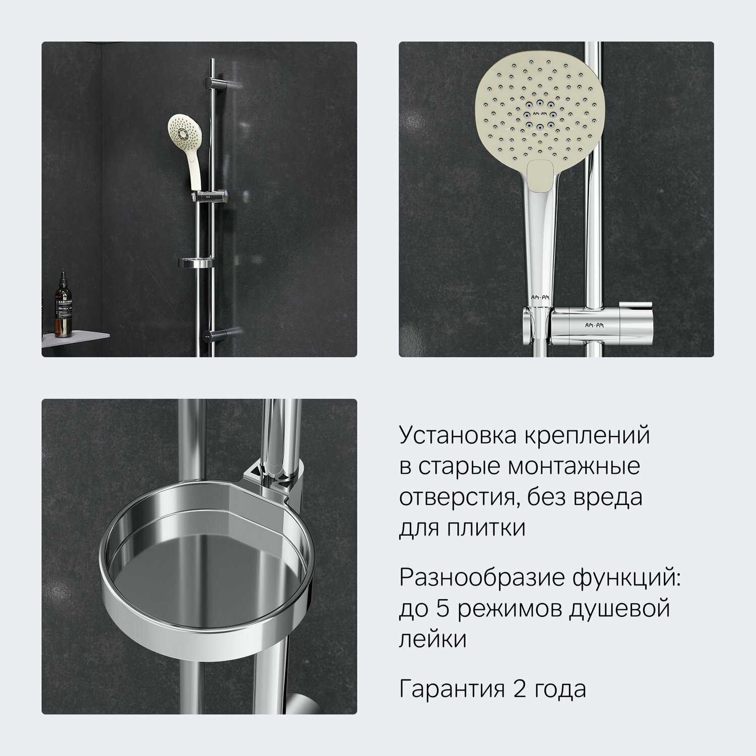 | Режимы : | массажная струя, мягкая струя, смешанная струя, тропический дождь |