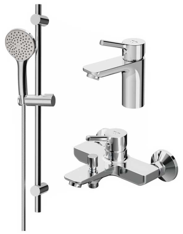 - + Комплект 3 в1 в едином стиле. Компромиссная цена. Хорошо выглядит, легко смывается налет. На изливах угол 45°, очень продумано. Струя течет в руки, а не под гусак. Ходы ручек смесителя мягкие, приятные. С монтажом никаких проблем, всё отлично собирается и устанавливается. Всего хватает.