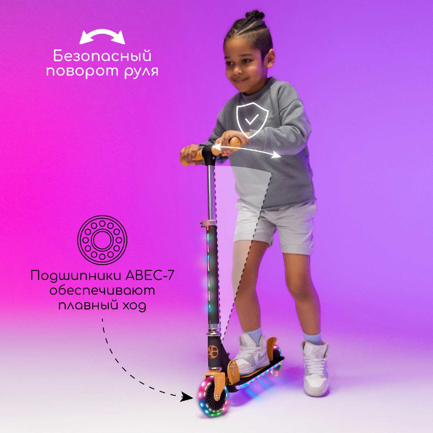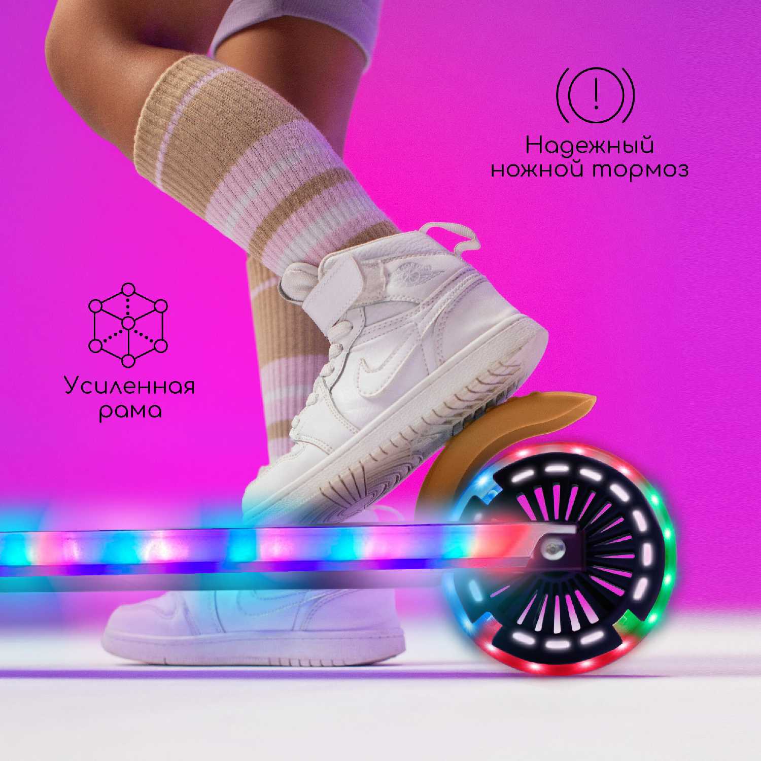 - + Самокат-огонь. Вечером переливается всеми цветами. Девочке 110см вполне комфортно. Кто-то писал что подножка высокая-ничего подобного, как у всех.
