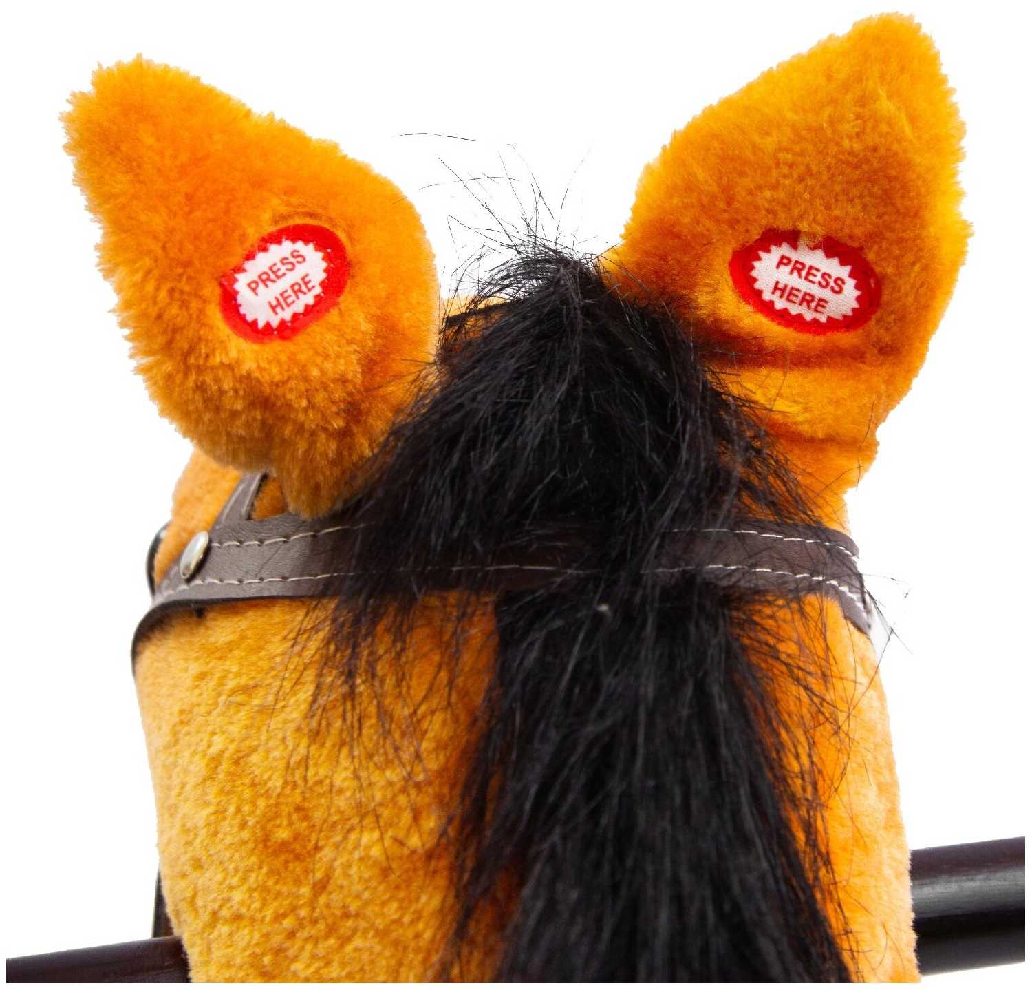 - + Качество лошадки-качалки отличное : быстро собрали, все детали подходят, всё плотно прилегает, нет запаха, игрушка не окрашивается, грива и хвост не вылезают, даже когда кот охотится за махающим хвостом. При нажатии на правое ушко лошадка скачет ("тыгы-дык, тыгы-дык, тыгы-дык" и ржёт( чередуясь) по 3 раза довольно громко, при этом открывая рот и махая хвостом, по окончании слышится: "бр-рр". При нажатии на левое ушко, она машет хвостом, открывает рот, по-английски бодро что-то выдаёт, после этого поёт ковбойскую весёлую песню тоже 3 раза...