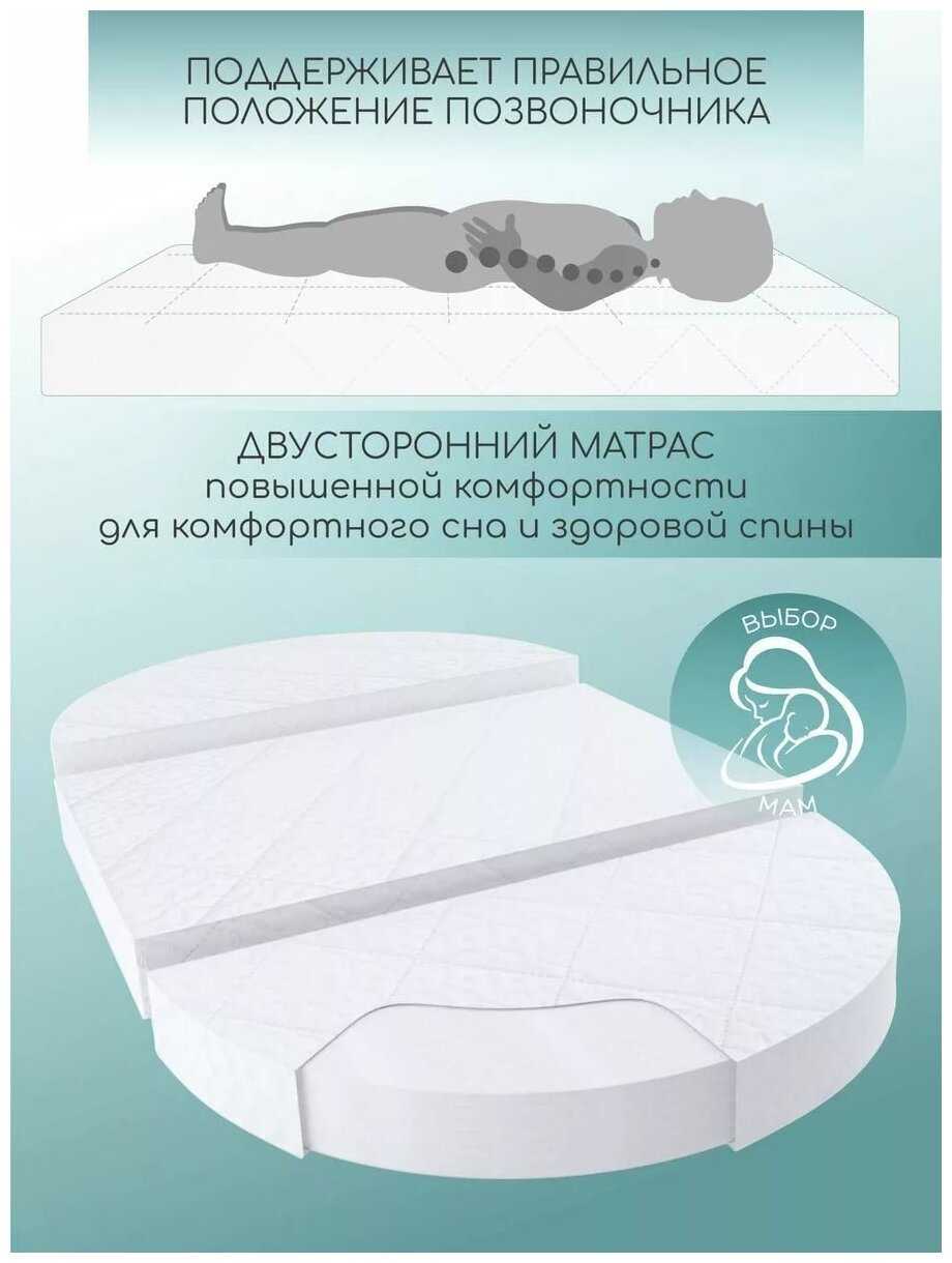 - Идеально совмещается с кроватками-трансформерами (например, размер 125×75 см для овала).