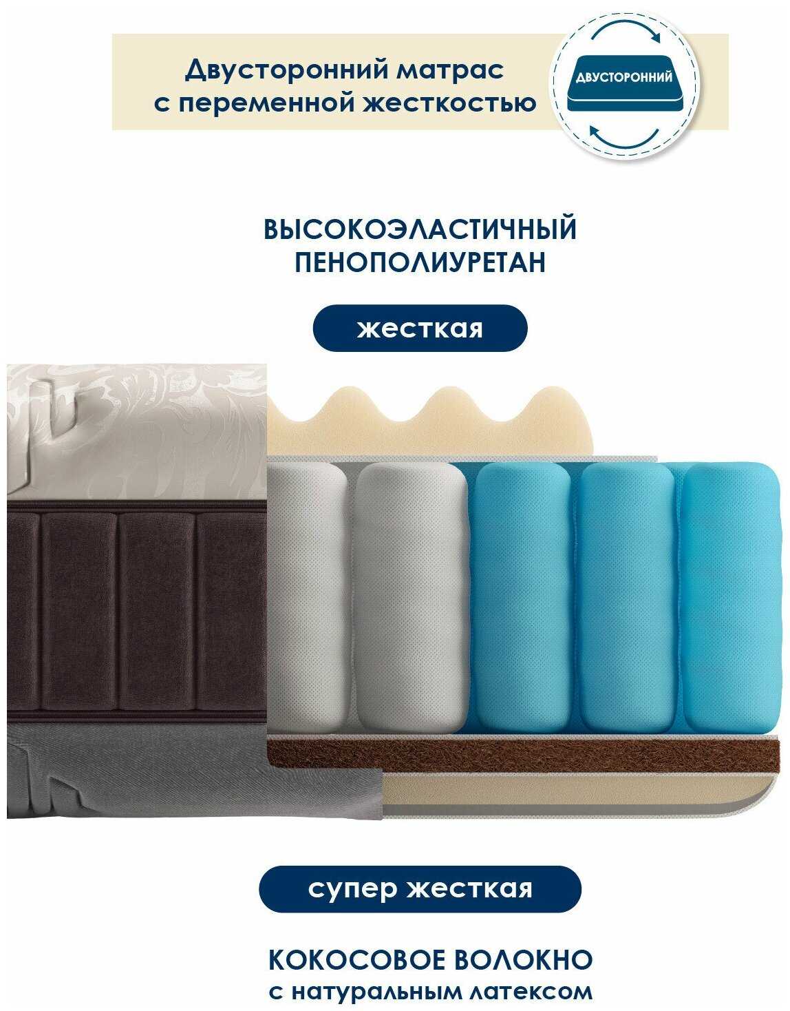 Второй матрас купленный нами. Первый был для ребенка, 90*200. Сначала протестировали его 2 месяца, потом решили и себе купить. Матрас отличный, не проминается когда переворачиваешься. Спать очень комфортно. 2 стороны, белая помягче, серая пожестче. Мы спим на серой...спим и кайфуем) Привезли матрас в скрутке.