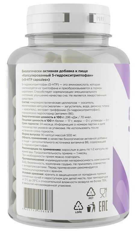 Характеристики:- основной ингредиент: 5-гидрокситриптофан