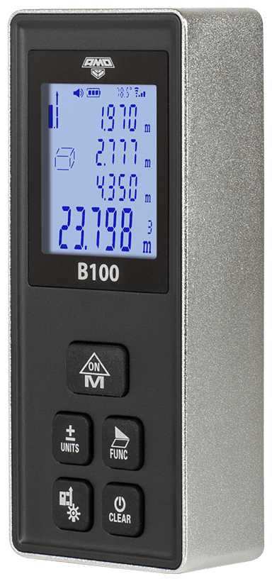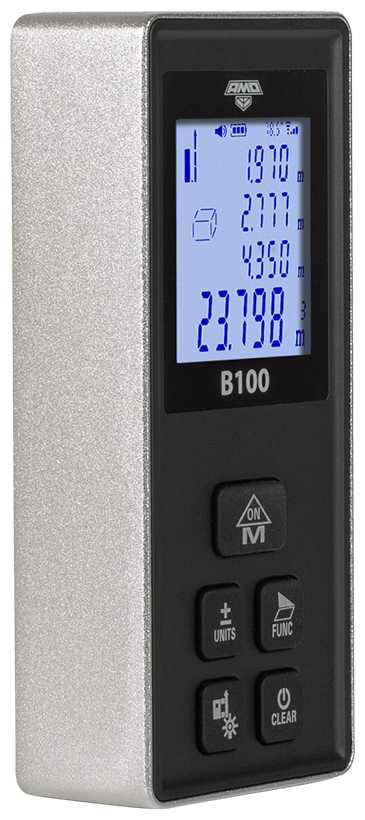 Металлический корпус, наличие подсветки, умеет высчитывать площадь, объем, есть инклинометр. Работает быстро.