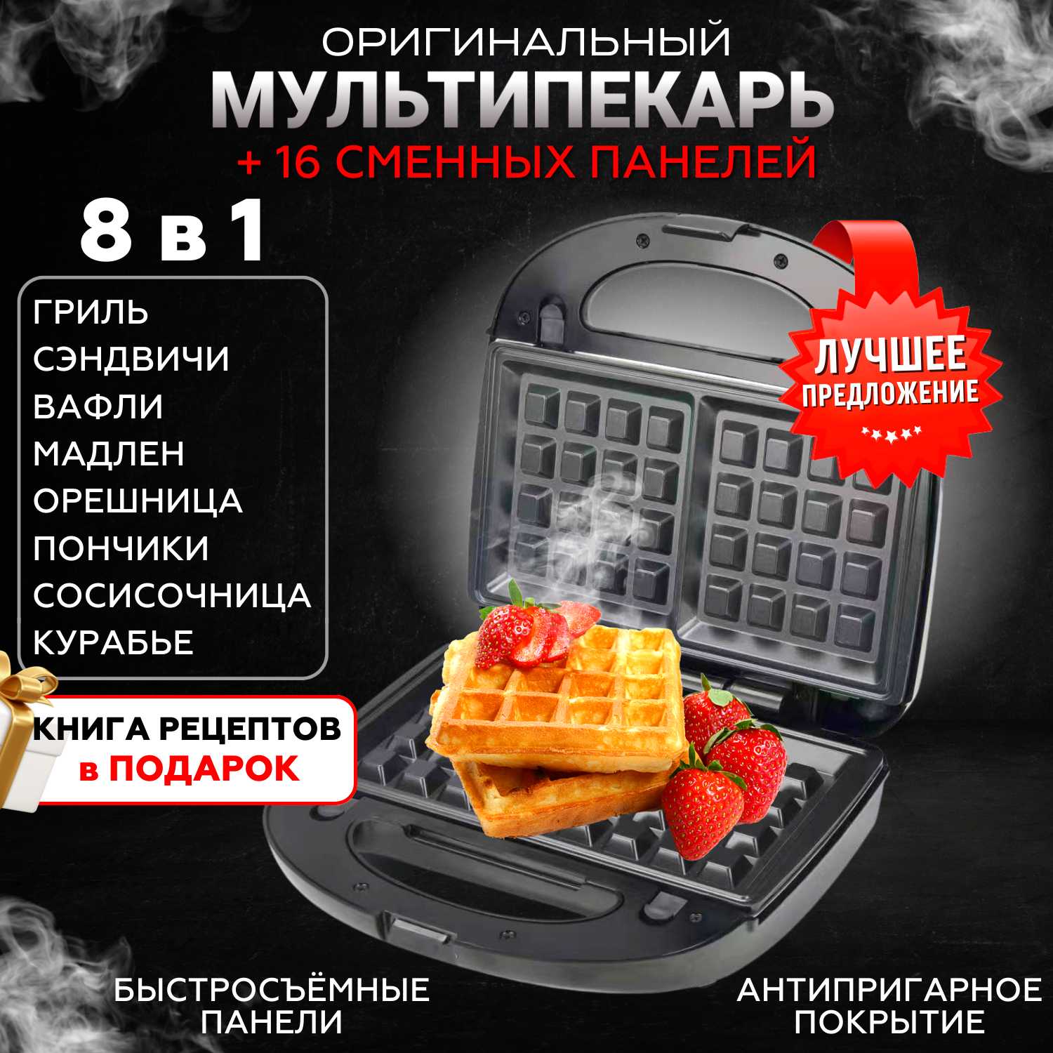 - + много панелей для разных вкусностей,надежная конструкция,прост в уходе,панели легко меняются,быстро печет,👍 ничего не прилипает