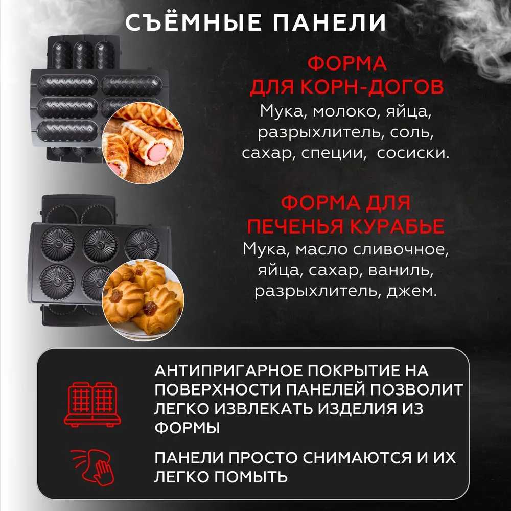 - Позволяет готовить вафли, сэндвичи, оладьи, гриль, корн-доги и пироги без дополнительных приборов.