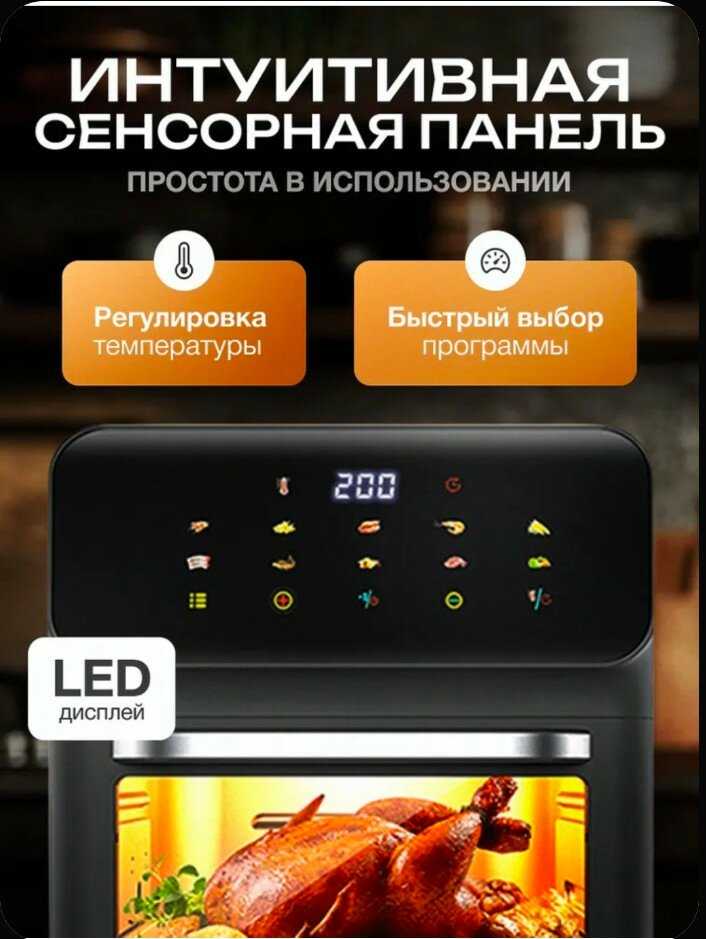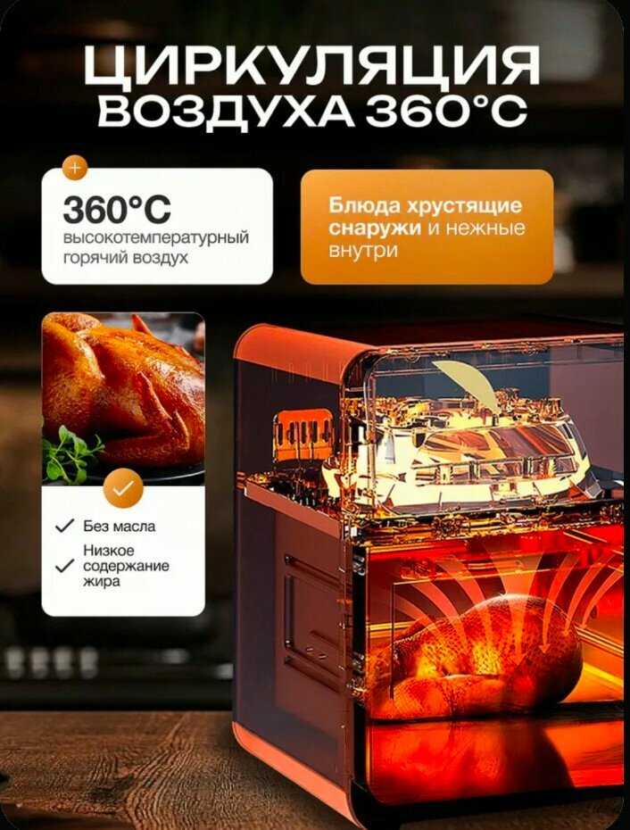 - - Пока не обнаружила при готовке, отпишусь потом,но если честно еле нашла в интернете перевод на русский язык по фото итог на картинке первой где цветные картинки овощей,мяса там прямо самая первая это ,что чашка с лимоном или супница маленькая не понятно совсем даже по фото и третье это мясо куски филе например?В общем попробую маленькую курочку совсем маленькую приготовить . Когда она уже включена и начала работать режим я выставляла сама почему-то включается режим конференции сверху такой маленький круглый , если нажать на сенсорную кнопку ещё один раз,то он будет быстрее крутить, ещё раз нажать медленнее.На картофель не меня одной не получится приготовить так,как пор середине нет возможности поставить противень. Только наверху самом думаю так лучше не делать прямо в по самый верх не стала. Ожидания конечно другие были.Но в целом так,как маленькая думаю ,что на один раз приготовить можно и то на 1,5 порции если не меньше справа курица кусочки,слева как картошечка.