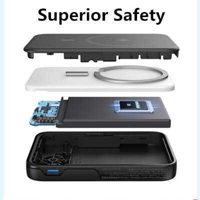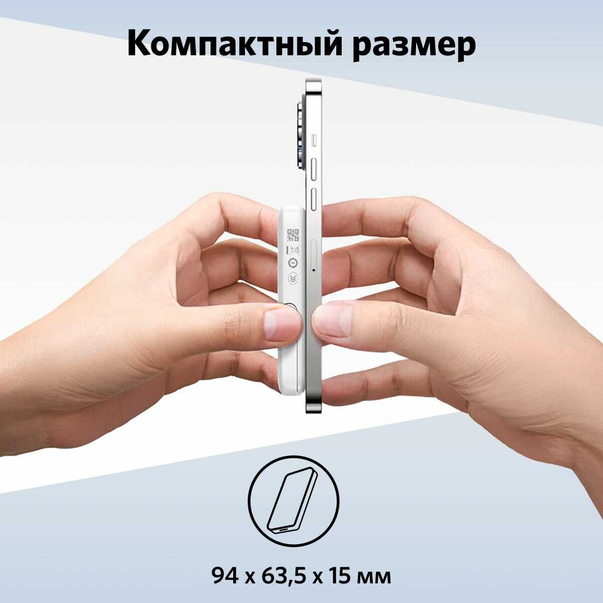 Аккумулятор обеспечивает стабильную беспроводную зарядку через MagSafe для iPhone 12 и новее. Мощность составляет 7.5W, что медленнее проводного подключения, но позволяет дозаряжать телефон в экстренных ситуациях. При использовании с чехлами MagSafe крепление надежное, однако в жаркую погоду возможен перегрев, приводящий к автоматической остановке процесса. -