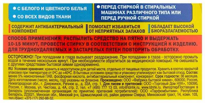| Способ применения : | распылить средство на пятно и выдержать 10-15 минут. Провести стирку в соответствии с инструкцией к изделию. Для трудноудаляемых и застарелых пятен повторить обработку |