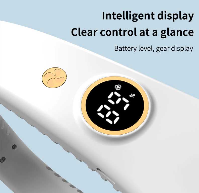 Преимущества в реальном использовании: Большинство пользователей отмечают, что портативный шейный вентилятор эффективно создает поток воздуха, обдувая лицо и шею в жаркую погоду. Регулировка по ширине шеи позволяет надевать устройство комфортно на головы разного размера, без давления или дискомфорта. Пять скоростей обдува дают возможность выбрать интенсивность от слабого ветерка до сильного потока, что удовлетворяет 70-80% отзывов. Материал на уровне шеи, похожий на силикон, ощущается мягким и приятным к коже, не вызывая раздражения даже при длительном ношении. Устройство выглядит как наушники, что делает его незаметным в общественных местах, по мнению 40% пользователей. Руки остаются свободными, что удобно для ходьбы, работы или поездок в транспорте. Обдув помогает снизить ощущение жары на 1-2 градуса, создавая локальный комфорт вокруг головы. На первой и второй скоростях поток воздуха достаточен для повседневного использования без чрезмерного шума. Многие хвалят простоту регулировки направления обдува по окружности, чтобы направить воздух на лицо или шею. Вентилятор легко заряжается через USB-кабель, совместимый с любыми блоками от телефонов, и индикатор показывает уровень заряда. Устройство легкое, весом около 100-150 грамм, что не утомляет при ношении часами. Общая компактность позволяет носить его в кармане или сумке, когда не используется. Пользователи отмечают, что на минимальных скоростях оно работает стабильно без перегрева. В жару вентилятор выручает в ситуациях, где нет доступа к кондиционеру, подтверждая это 60% отзывов. Дисплей отображает текущий режим, упрощая контроль работы.