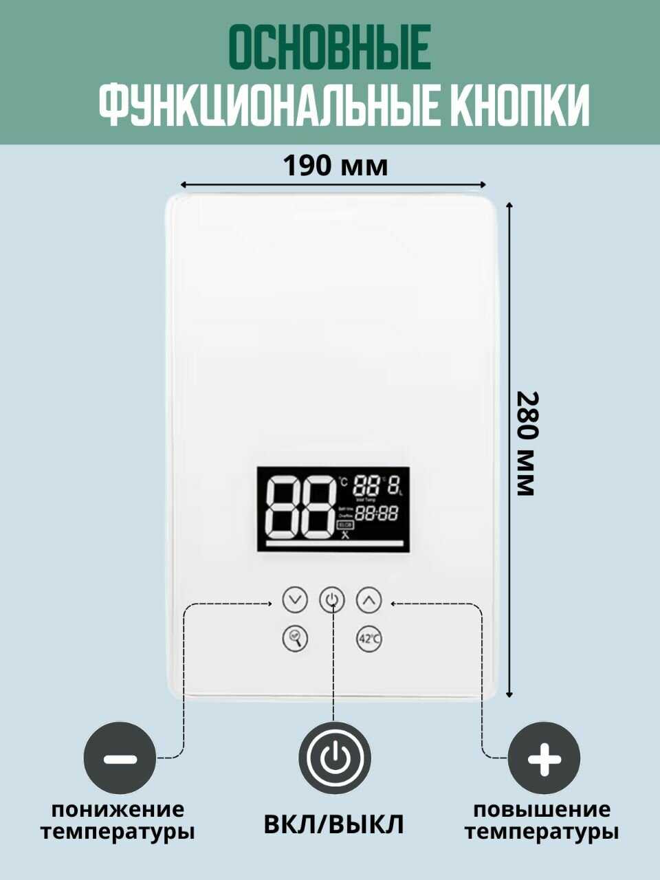 - + в широком диапазоне регулирует температуру воды.
