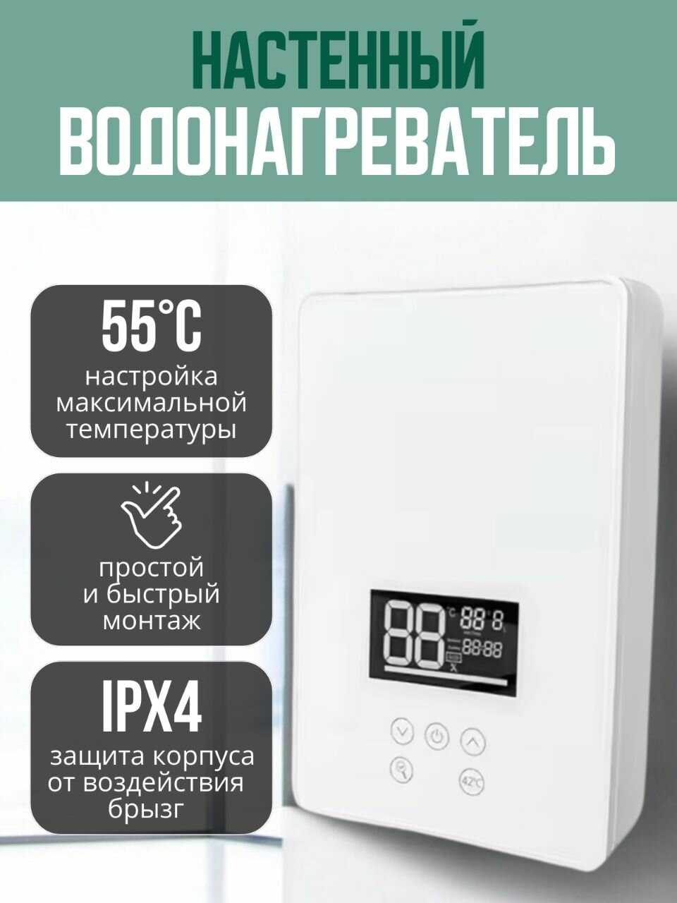 - Максимальная температура нагрева воды: 55 °C