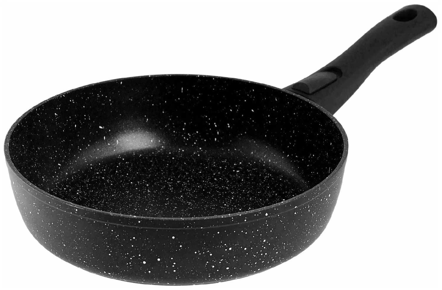 Прекрасная сковородка, высокий бортик. Опробовала, масла в разы меньше использовала. Лайфхак-что бы избавиться от наклейки, протрите место наклейки диском смоченным в подсолнечном масле.