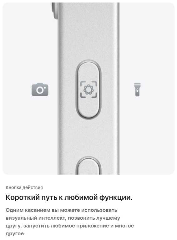 - Удобная переназначаемая кнопка Action Button с гибкой настройкой функций: