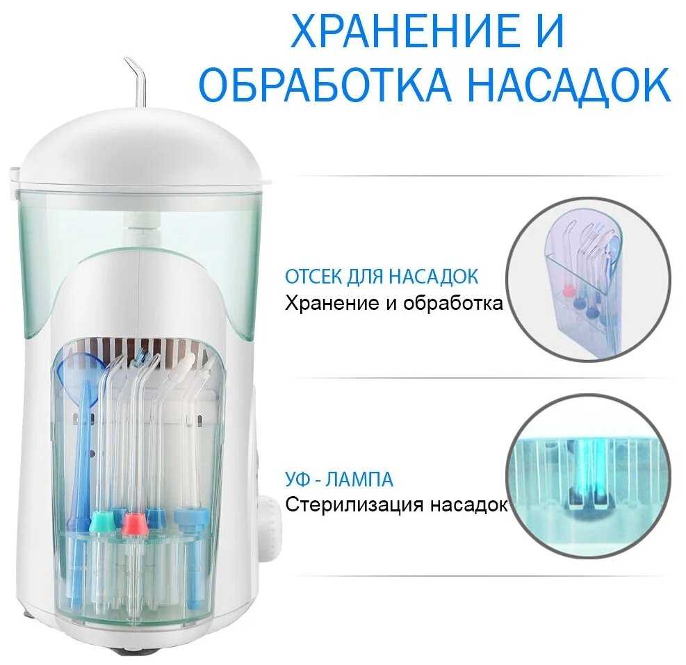 - + Цена, много универсальных насадок, хорошо прочищает межзубные пространства, уф-лампа здорово, в ней и хранятся насадки