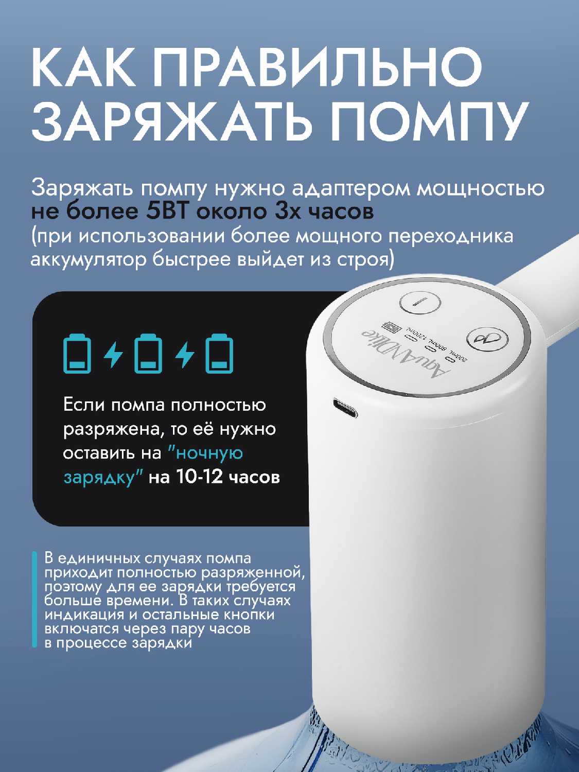 | Дополнительная информация : | электропомпа автоматическая с аккумулятором для бутилированной воды с двойным насосом. Комплектация: помпа для воды, кабель type-c, шланг (55 см) - 1шт., инструкция. |