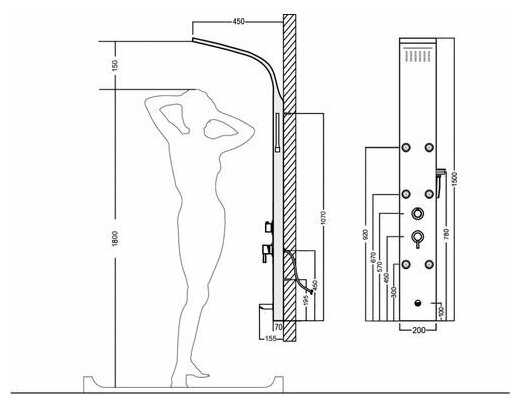 длина душевой панели: 1500 мм, ширина верхнего душа: 200 мм