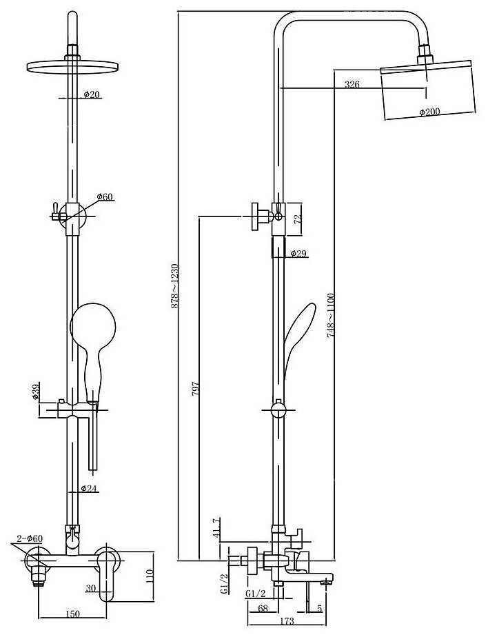 | Дополнительная информация : | высота стойки для душа: 1230 мм, диаметр душевой лейки: 100 мм, диаметр верхнего душа: 200 мм |