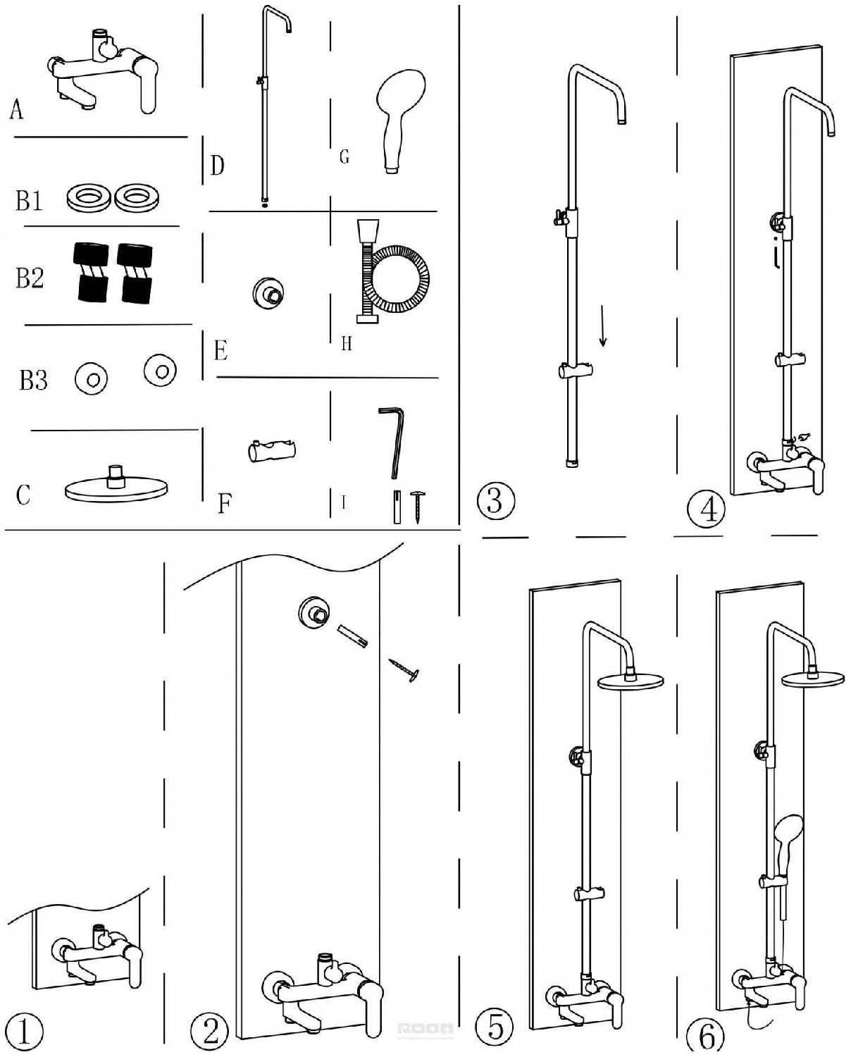 | Комплектация : | верхний душ, держатель лейки, душевая стойка, душевая штанга, излив для набора воды, лейка, переключатель потоков, ручной душ, смеситель, шланг |