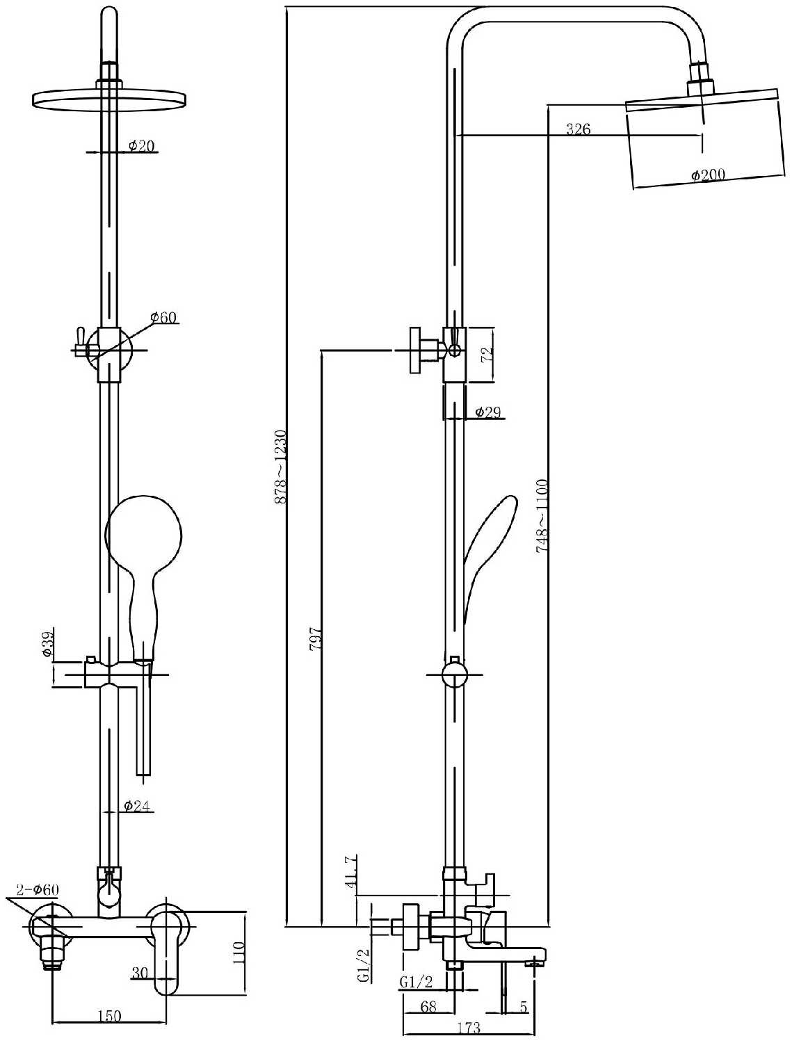 высота стойки для душа: 1230 мм, диаметр душевой лейки: 100 мм, диаметр верхнего душа: 200 мм