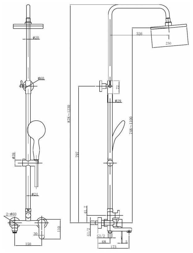 высота стойки для душа: 1230 мм, диаметр душевой лейки: 100 мм, длина верхнего душа: 200 мм, ширина верхнего душа: 200 мм