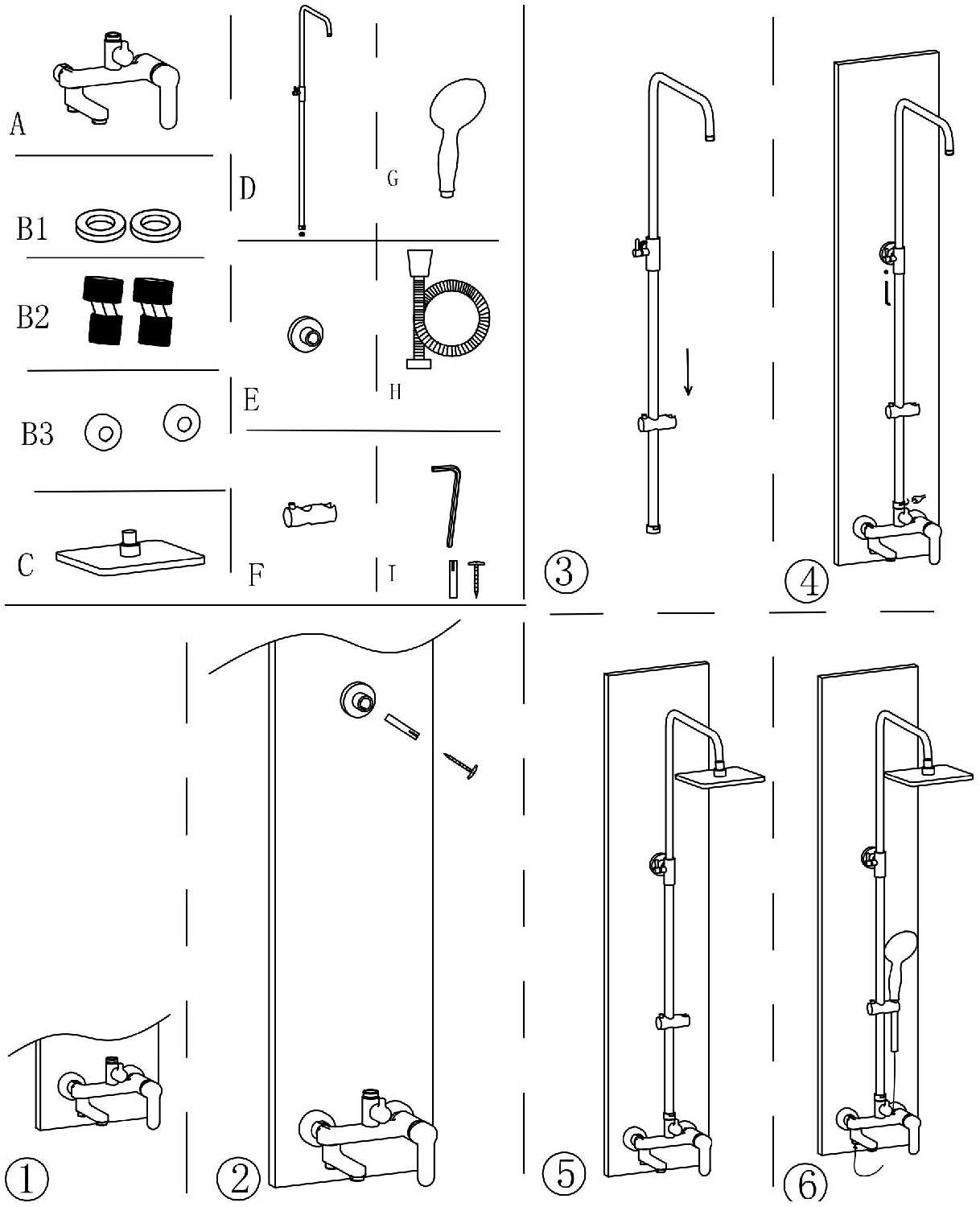 лейка, шланг, держатель лейки, верхний душ, душевая стойка, смеситель, переключатель потоков, душевая штанга