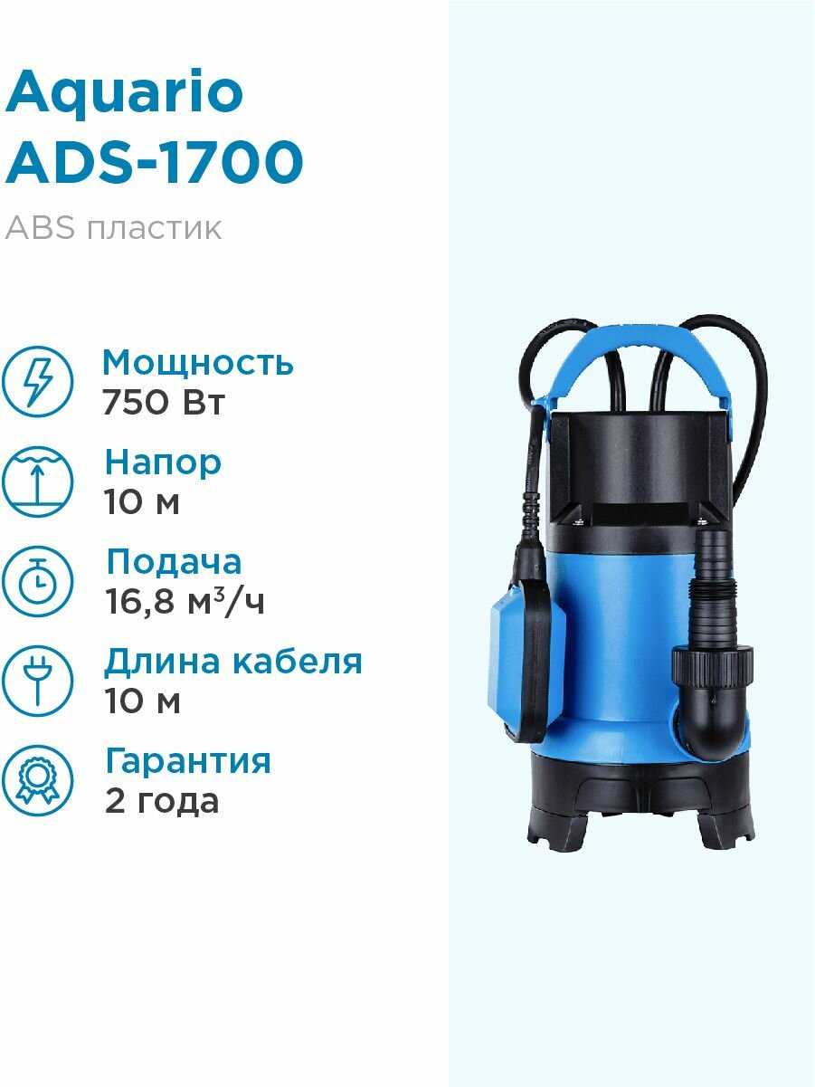 Подробная комплектация : | 1. Насос Дренажный насос Aquario ADS-1700 в сборе с кабелем и поплавковым выключателем - 1 шт. 2. Угловой отвод с адаптером для шланга - 1 шт. 3. Руководство по эксплуатации - 1 шт. 4. Упаковка |