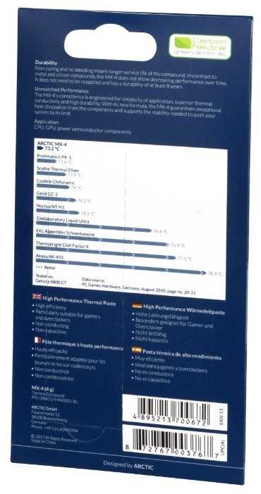 - + Производительность: ARCTIC MX-4 известна своей отличной теплопроводностью, что способствует эффективному рассеиванию тепла от процессора или графического процессора. Это помогает поддерживать стабильную работу системы и предотвращает перегрев.