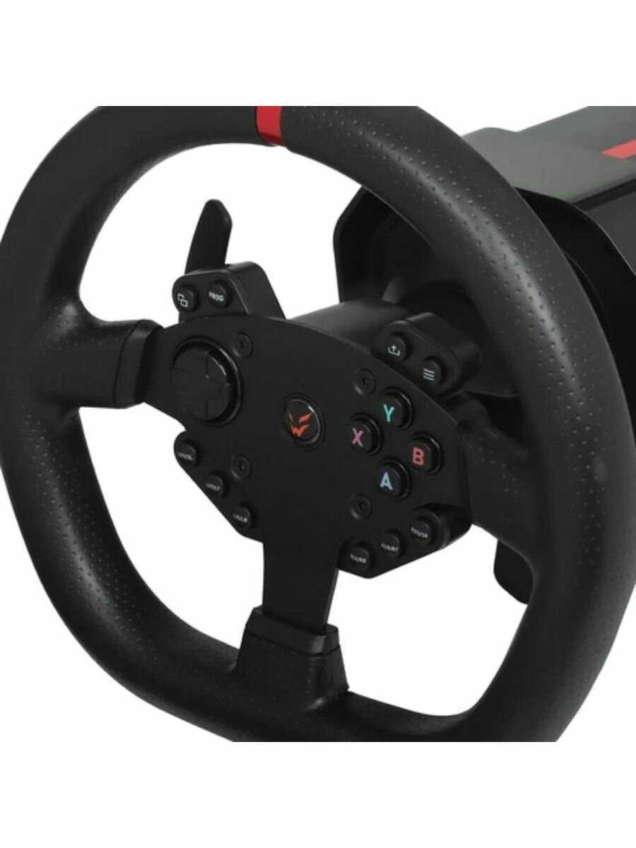 - + 900-градусный руль и корпус 6+1 передач, педали с регулируемой жесткостью и ходами, отдельная кнопочная панель; коробка передач имеет отдельные кнопки; можно настроить силу фидбека через приложение на телефоне; удобная сборка и совместимость с популярными играми.