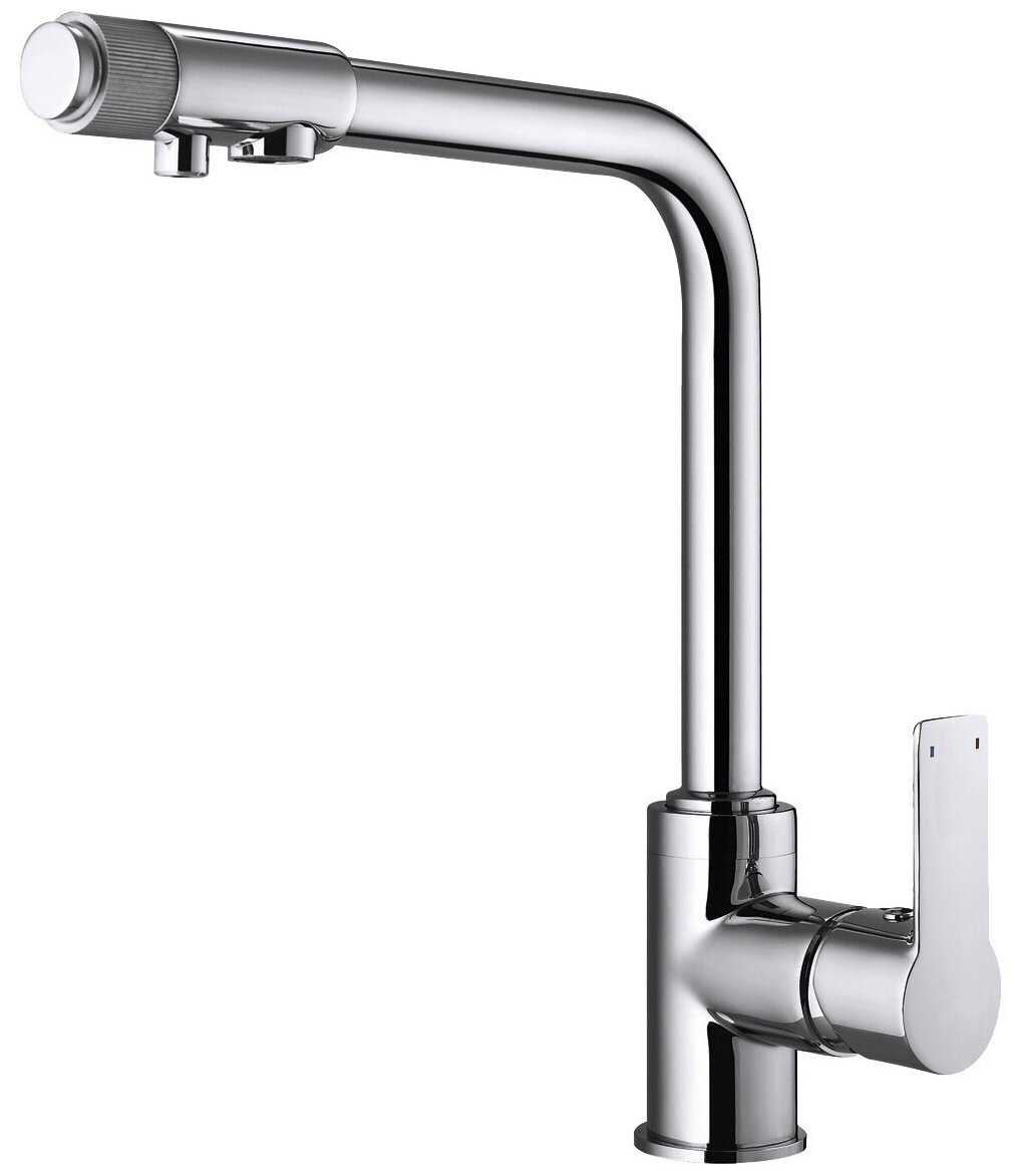 Невероятно красивый и стильный смеситель, очень напоминает какой-нибудь профессиональный и при его использовании чувствуешь себя настоящим шеф поваром. Он подключается к обычному водоснабжению и к специальному фильтру, и если повернуть специальный крутящийся рычажок, то из под крана можно будет пить вкусную и безопасную воду. Смеситель очень любит собирать воду, поэтому его надо часто протирать от капель воды.