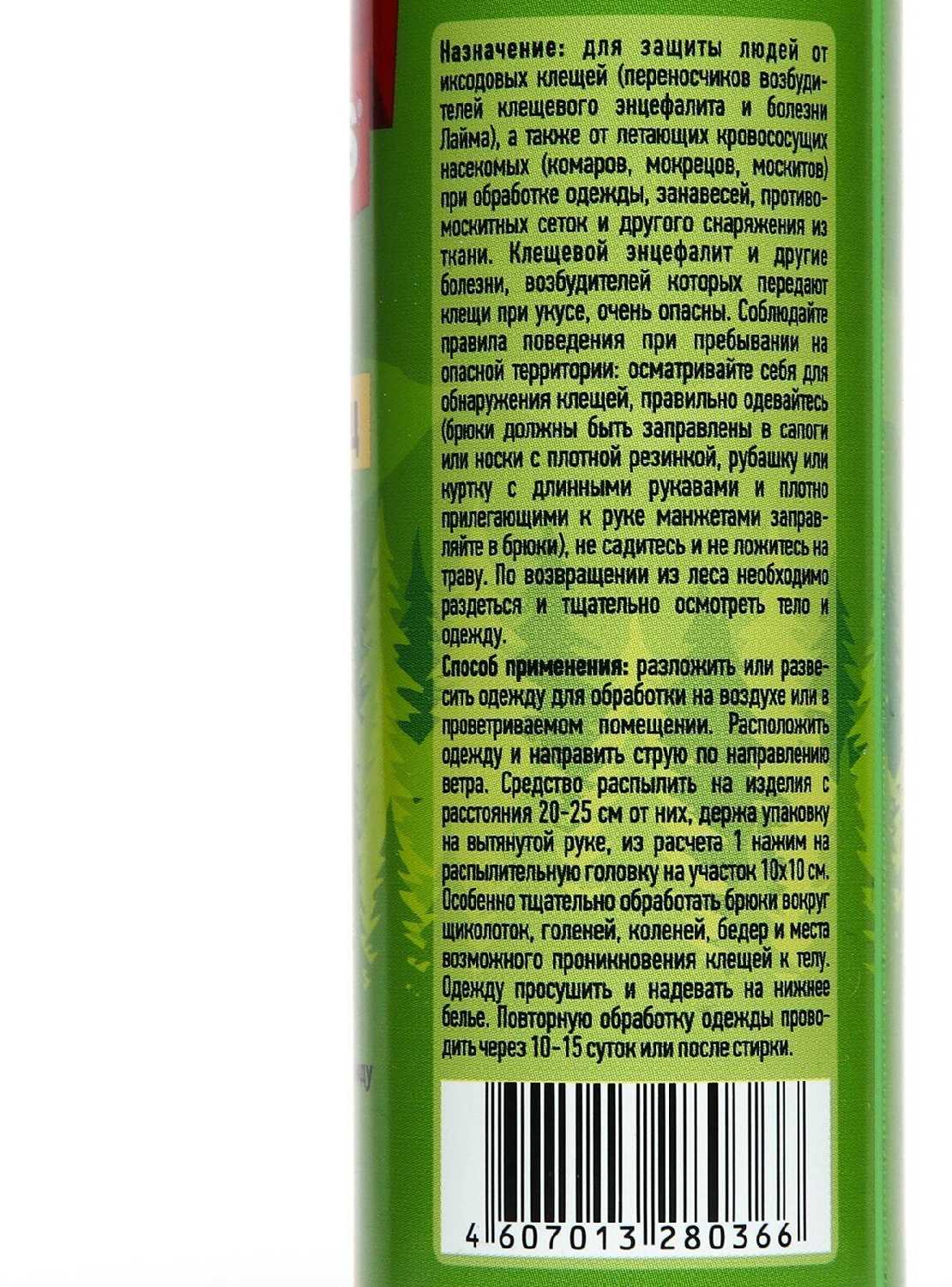 | Способ применения : | Разложить или развесить одежду для обработки на воздухе или в проветриваемом помещении. Расположить одежду и направить струю по направлению ветра. Средство распылять на изделие с расстояния 20 - 25 см от них, держа упаковку на вытянутой руке, из расчета 1 нажим на распылительную головку на участок 10 х 10 см. Особенно тщательно обработать брюки вокруг щиколоток, голеней, коленей, бедер и места возможного проникновения клещей к телу. Одежду просушить (не менее 2 часов) и надевать на нижнее белье. Повторную обработку одежды проводить через 10 - 15 суток или после стирки. Не обрабатывать одежду на человеке и не надевать ее до полного высыхания. |