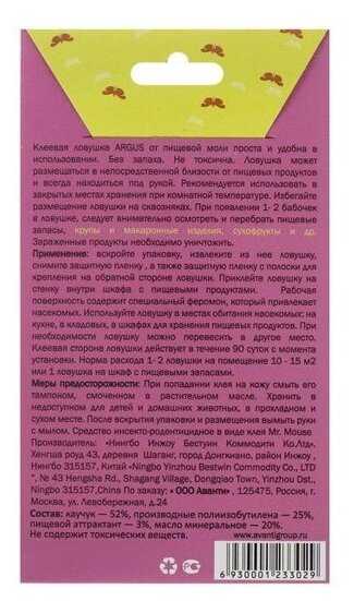 | Подробная комплектация : | Клеевая ловушка Argus, от пищевой моли, 2 шт. |