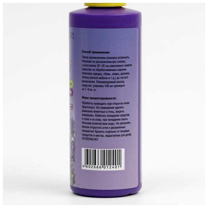 | Способ применения : | флакон встряхнуть, нажимая на распылительную головку с расстояния 20 - 25 см равномерно нанести средство на обрабатываемые изделия (верхнюю одежду обувь ковры. дорожки обивку мягкой мебели и т.д.) до легкого увлажнения, рекомендуемый расход средства: флакон 100 мл примерно на 7-9 кв/м |