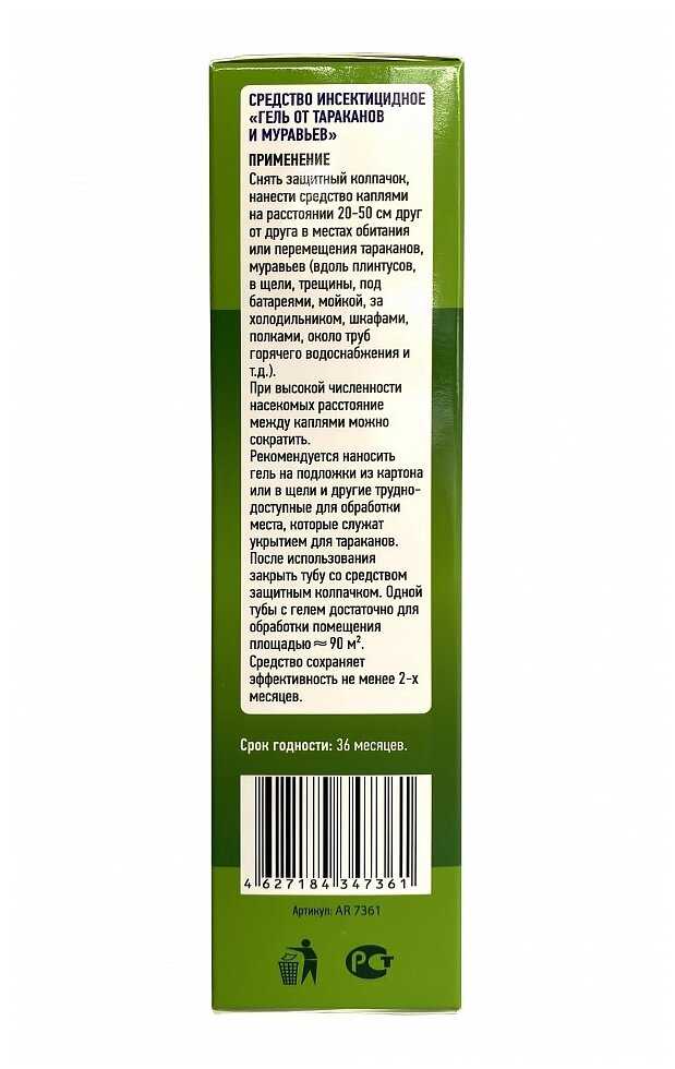 | Способ применения : | снять защитный колпачок нанести гель в места скопления или возможного перемещения насекомых каплями на расстоянии 20-50 см. друг от друга в местах обитания или перемещения насекомых (вдоль плинтусов в щели трещины под батареями мойкой за холодильником шкафами полками около труб горячего водоснабжения и т.д.), при высокой численности насекомых расстояние между капельками геля следует сократить, гель также можно нанести на поверхность листочка бумаги и разместить его на обрабатываемой площади |