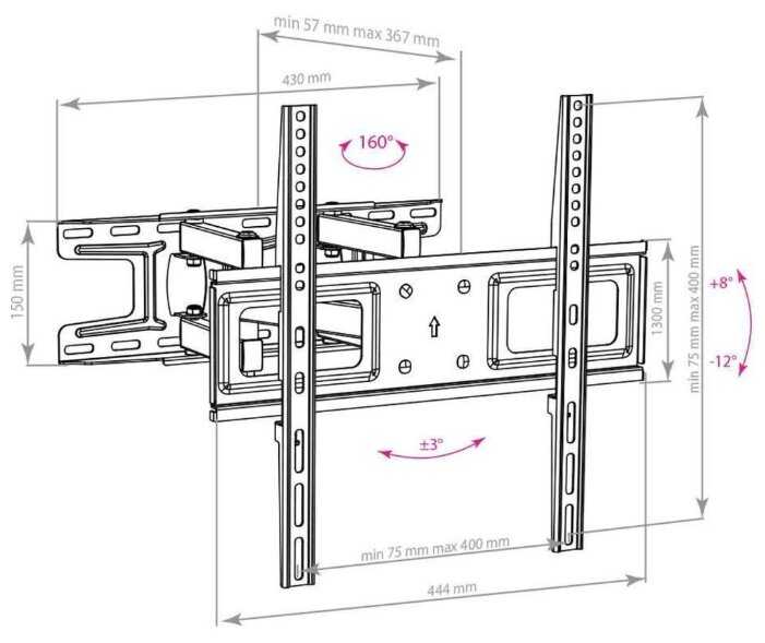 - Механизм позволяет изменять положение телевизора по вертикали (±15°), горизонтали (до 40°), выдвигать от стены на 40 см.