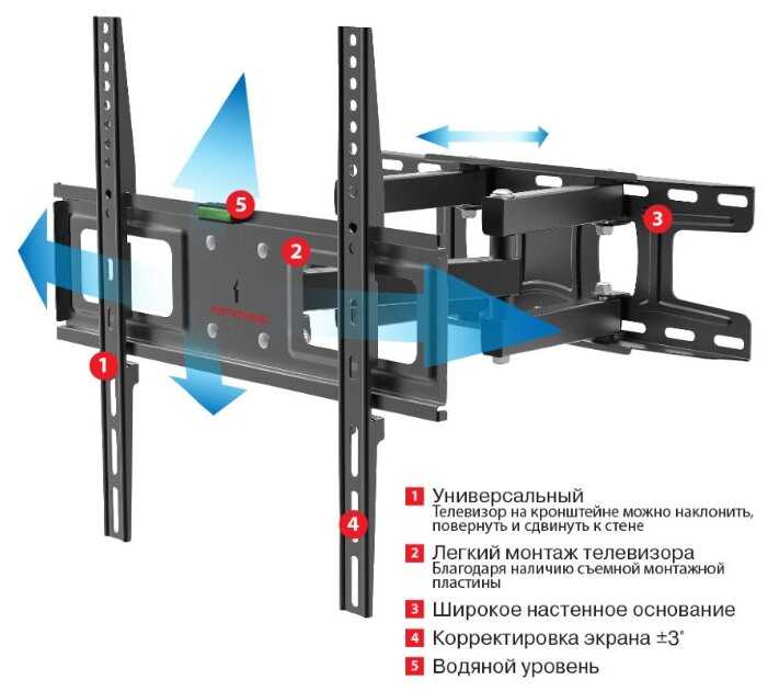 - Фиксация положения двумя винтами усложняет юстировку — нужен помощник для удержания 50+ дюймовых моделей.