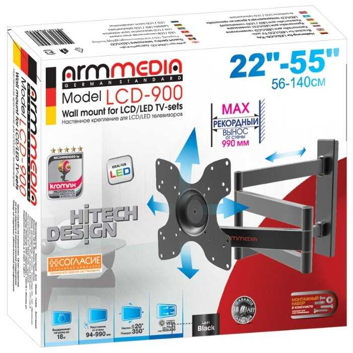 - Многие пользователи отмечают, что это единственный кронштейн с таким выносом и подходящей грузоподъемностью для мониторов 42" (9,5 кг) и ТВ до 55" (17 кг).