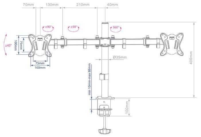 - Регулировка углов между мониторами до 170 градусов, позволяет расположить их стык в стык для комфортного обзора, если вес равномерный.