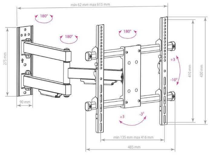 - Поворот на 90° для просмотра из разных зон комнаты, выдвижение от стены для подключения кабелей, наклон вверх/вниз.