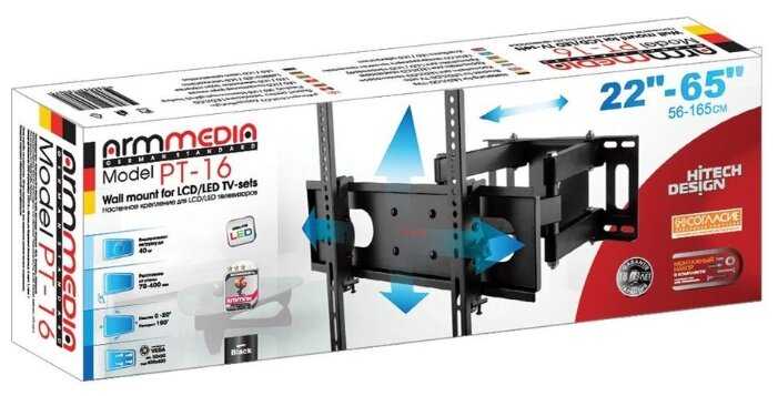 Купил кронштейн Arm Media PT-16 для крепления на стену панели OLED55C1RLA. Вес ТВ по паспорту 19 кг. Выбрана данная конструкция по причине установки ТВ в глубокой нише с небольшими боковыми зазорами. При креплении кронштейна к стене перестраховался и добавил еще 4 точки крепления. После установки ТВ на кронштейн стало очевидно, что он провис под весом, что было компенсировано наклоном панели - благо есть регулировка по наклону (расстояние от задней стенки ТВ до стены 150мм для охлаждения). Думаю больший вес может держать нормально только в сложенном состоянии.