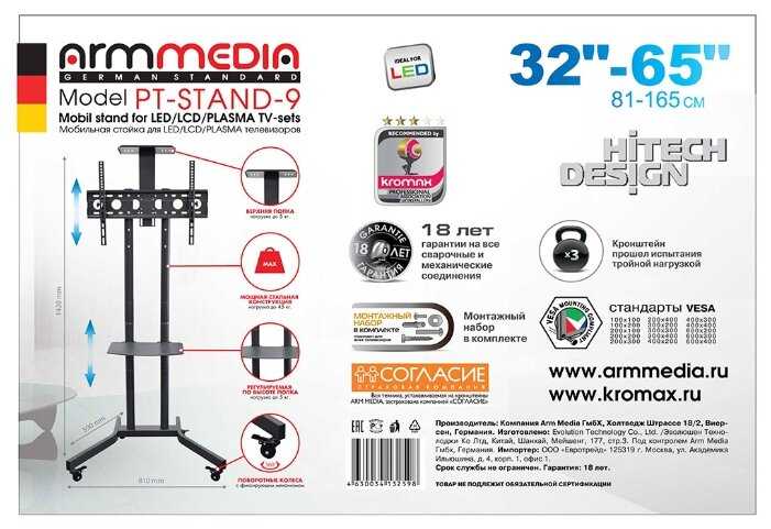 Сняли свой шестидесяти дюймовый телевизор со стены и после окончания ремонта решили установить на напольный кронштейн, что б был более менее мобильный и его можно было бы перемещать в случае необходимости. Долго не могли найти подходящую по параметрам стойку, пока наконец не наткнулись на эту стойку Arm media PT-STAND-9. Стойка не из дешёвых, но она того однозначно стоит. Отличное качество сборки, прочный металл, соответственно и нагрузка на неё допускается...
