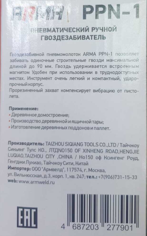 | Комплектация : | Пневматический наладонный гвоздезабиватель ARMA PPN-1 - 1шт |