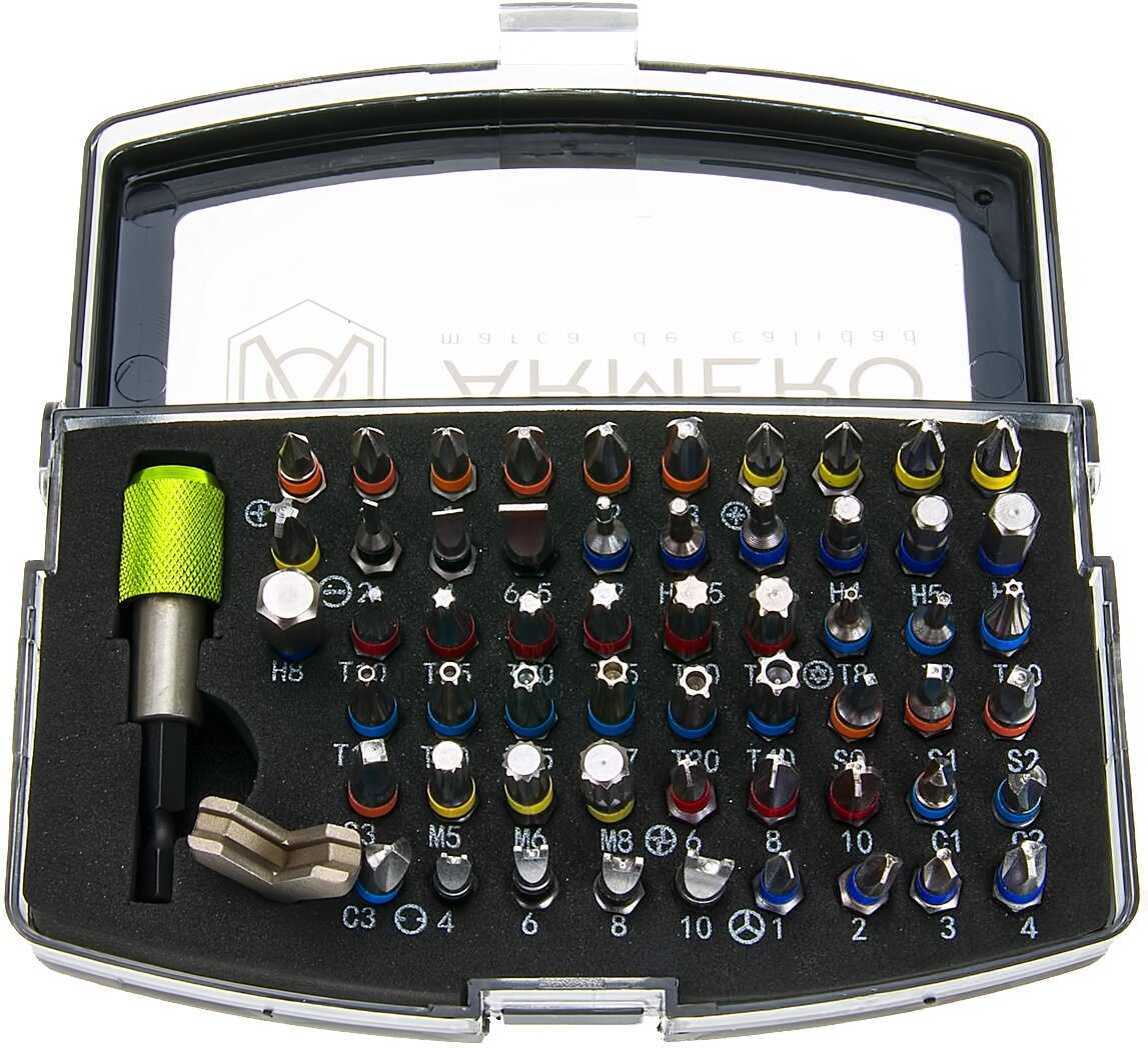| Биты подробно : | 25 мм: SL2, SL4, SL6.5, PH0, PH1, PH2, PH3, PZ1, PZ2, PZ3, H2, H2.5, H3, H4, H5, H6, H8, T10, T15, T20, T25, T30, T40, TR8, TR9, TR10, TR15, TR25, TR27, TR30, TR40, S0, S1, S2, S3, M5, M6, M8, TS6, TS8, TS10, CL1, CL2, CL3, S4, S6, S8, S10, TW1, TW2, TW3, TW4 |